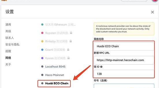 2.设置参数并保存即可?,网络名称:Huobi?ECOChain新增RPCURL:?https://http-mainnet.hecochain.com????链ID:128