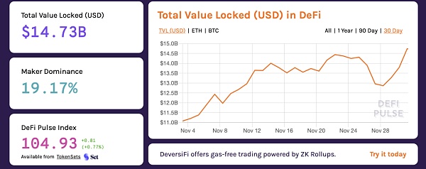 截止到12月1日下午3点,以太坊2.0存款合约已存入87.7万枚ETH,当前年化收益约为17.7%。距离以太坊2.0的启动只剩几个小时了,包括Coinbase、Huobi等各大交易所也将陆续推出小额ETH的一键质押服务,降低散户参与质押的门槛,可以预见未来将有更多的ETH被锁仓,市场上的流通卖盘将会大大减少。