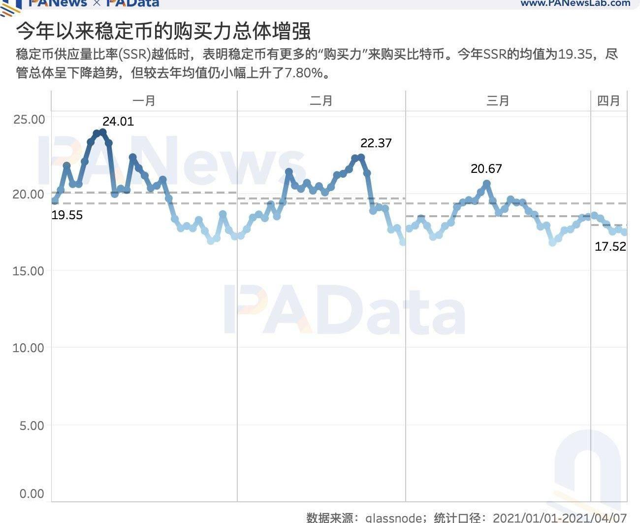 美元稳定币大量“印钞”,使得其市值规模大幅上涨,这大大提高了稳定币的购买力水平。根据比特币市值与稳定币市值的比得到了稳定币供应量比率,这是衡量稳定币购买力的一个指标,当这一指标越低时,意味着稳定币购买力越强,此时稳定币的扩张速度超过了比特币币价的上涨速度。