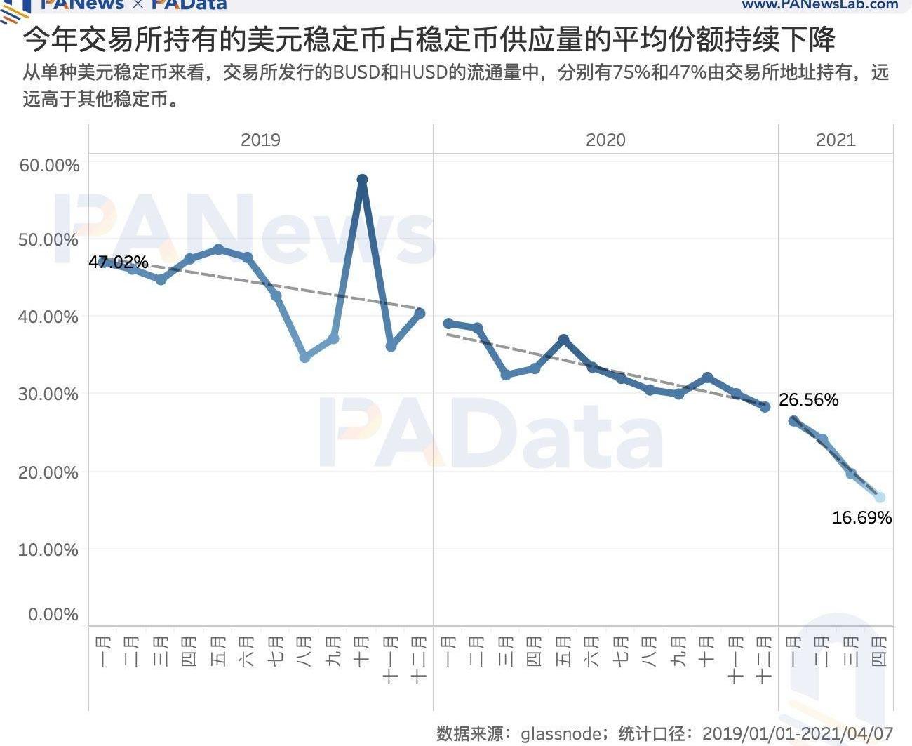 从交易所持有的美元稳定币占各稳定币供应量比重的变化中来看,近两年,交易所地址所持有的美元稳定币占各稳定币供应量的比重一直在持续下降,2019年初,这一比重的均值还有47.02%,而到今年4月7日,这一比重的均值就只有16.69%了,三年大幅下降了30个百分点左右。而且这一趋势还有加快发展的倾向,仅今年,交易所地址所持有的美元稳定币占各稳定币供应量的比重就下降了近10个百分点。