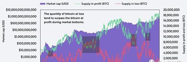 图中绿线是盈利的币量,红线是亏损的,按历史情况,牛市两者相差越来越远,两者重合或亏损多过盈利也意味着熊市底部区域,这可能是通过链上数据很形象的表示了什么叫牛市所有人都赚钱,哈哈。