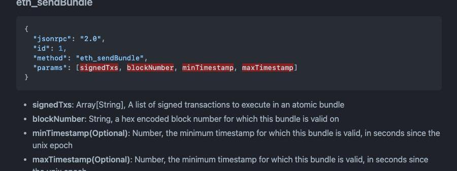 使用者可使用MEV-Geth广播称为Bundle的交易包;一个Bundle内包含的信息有:一个交易列表,套利计算区块高度,最小最大超时时间。在单个Bundle上链的区块中,发送者会通过coinbase交易,向出块者支付ETH作为分佣。