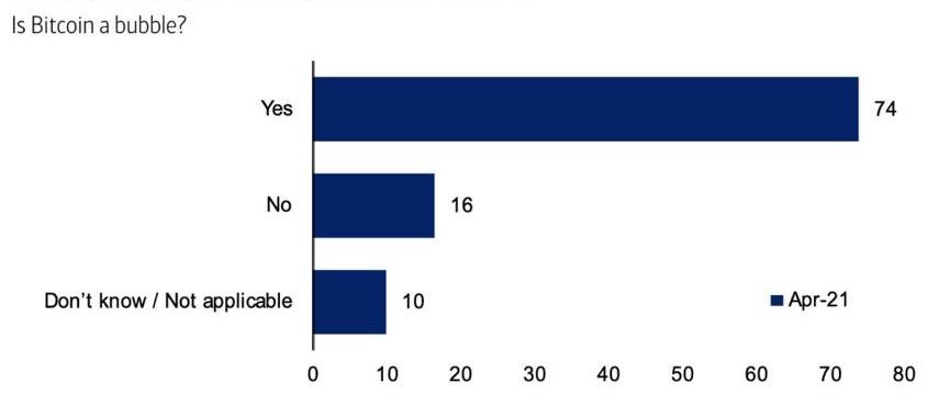 然而,根据美国银行的调查,比特币仍然是一个泡沫。该银行调查了管理着5,330亿美元的资产的200名顶级投资者。74%的受访者认为比特币绝对是个泡沫,16%的人相信比特币不是泡沫,10%的人不愿接受调查。