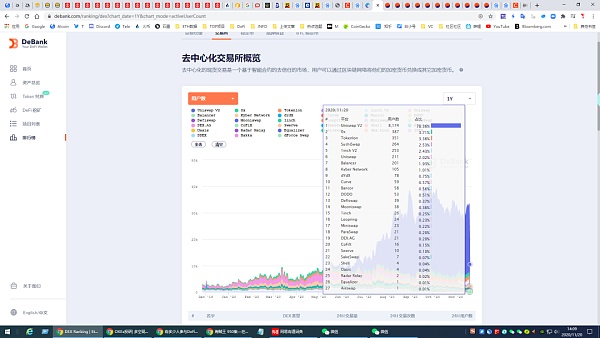 2020年9月26日是用户数的高峰,可以看到Uniswap日活用户为2.7万,占比62.7%,2.7万除以62.7%得出4.3万,这就是今年DEX(去中心化交易所)的最高峰日活了,加上没有统计的,大概也就是5万用户左右。