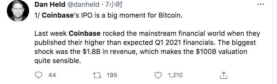 而关于Coinbase的估值,DanHeld认为,上周Coinbase发布高于预期的2021年Q1财务报告后,震惊了主流金融领域,其中最大的冲击点在于其1季度18亿美元的收入,这使得Coinbase1000亿美元的估值是相当合理的。