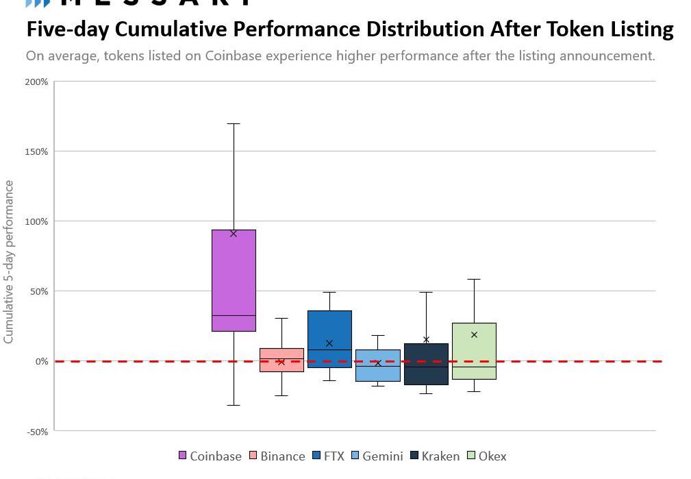 对于每一个交易所,我们都将代币上线交易所后5天的累积收益分布作为一个粗略的代理数据来观察其效果。毫不奇怪的是,上线Coinbase的平均回报率是最高的,数据为91%,但其收益分布范围也最为广泛,从-32%到645%。