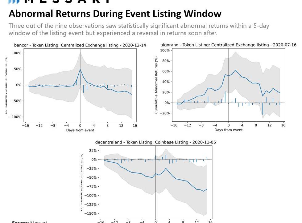 在剔除了异常样本之后,很明显的是,Coinbase上币的影响力仍然是最大的,其平均5天回报率为29%。从表面上看,这些结果表明,交易所上币往往会导致资产收益的增加。