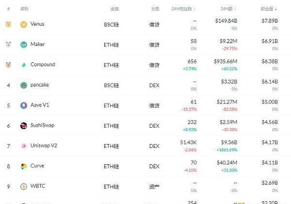 DeFi项目锁定资产前十排名及锁仓量,数据来源:Debank