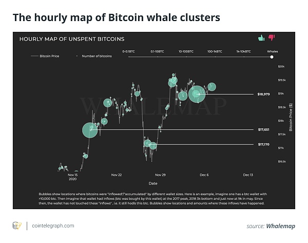 跟踪比特币鲸鱼活动的链上分析平台Whalemap上的鲸鱼集群也显示出类似的趋势。12月7日,Whalemap分析师表示,鲸鱼群显示三个近期支撑区域,分别为18979美元,17651美元和17170美元。