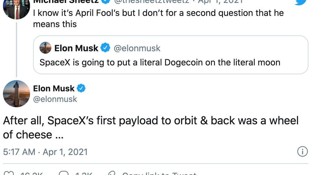 CNBC的太空记者MichaelSheetz转发了马斯克的推文,其表示:“我知道今天是愚人节,但我对此没有什么问题想问。”马斯克随后回复了Sheetz的转发:“毕竟,SpaceX第一个送入天空的物体是一个奶酪轮子……”