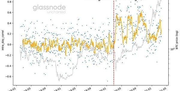 事实上,上述“相关性”是在2020年3月之后出现的,当日内BTC和S&P500指数的相关性从0上升到0.25。这是机构投资者进入的不利因素,加密货币市场和股票市场的投资者基础日益重叠。