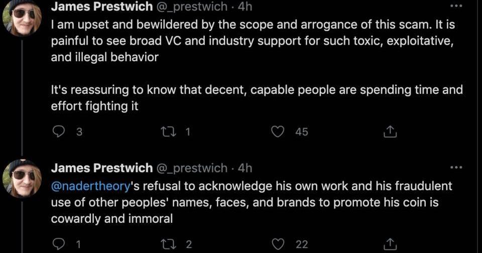 JamesPrestwich称,看到居然有这么多风投基金和大牌企业支持这种有甚至是非法的项目感到震惊。创始人nadertheory拒绝承认是自己创立的,并且拿别人的名声和品牌来推广自己的代币,这是不道德的鸡贼行为。总之,这是一个局,本质是让后入场的投资者为早期投资者接盘来获利。