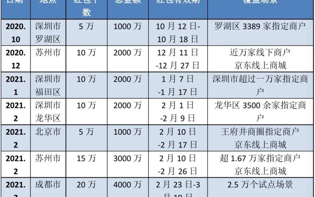 从表格可以看出,数字人民币红包试点工作开展频率在提高。仅在2021年2月份,就有深圳、北京、苏州三个城市开展红包试点。其中,2月份深圳的数字人民币红包发放活动已是该城市开展的第三次试点,苏州是第二次试点。此外,刚结束一轮数字人民币红包发放活动的成都,也将开展又一次红包活动。据媒体报道,工商银行成都分行将在3月26日启动新一轮数字人民币体验活动。随着各地试点条件的成熟,将迎来更加密集、覆盖范围更广的数字人民币试点工作。