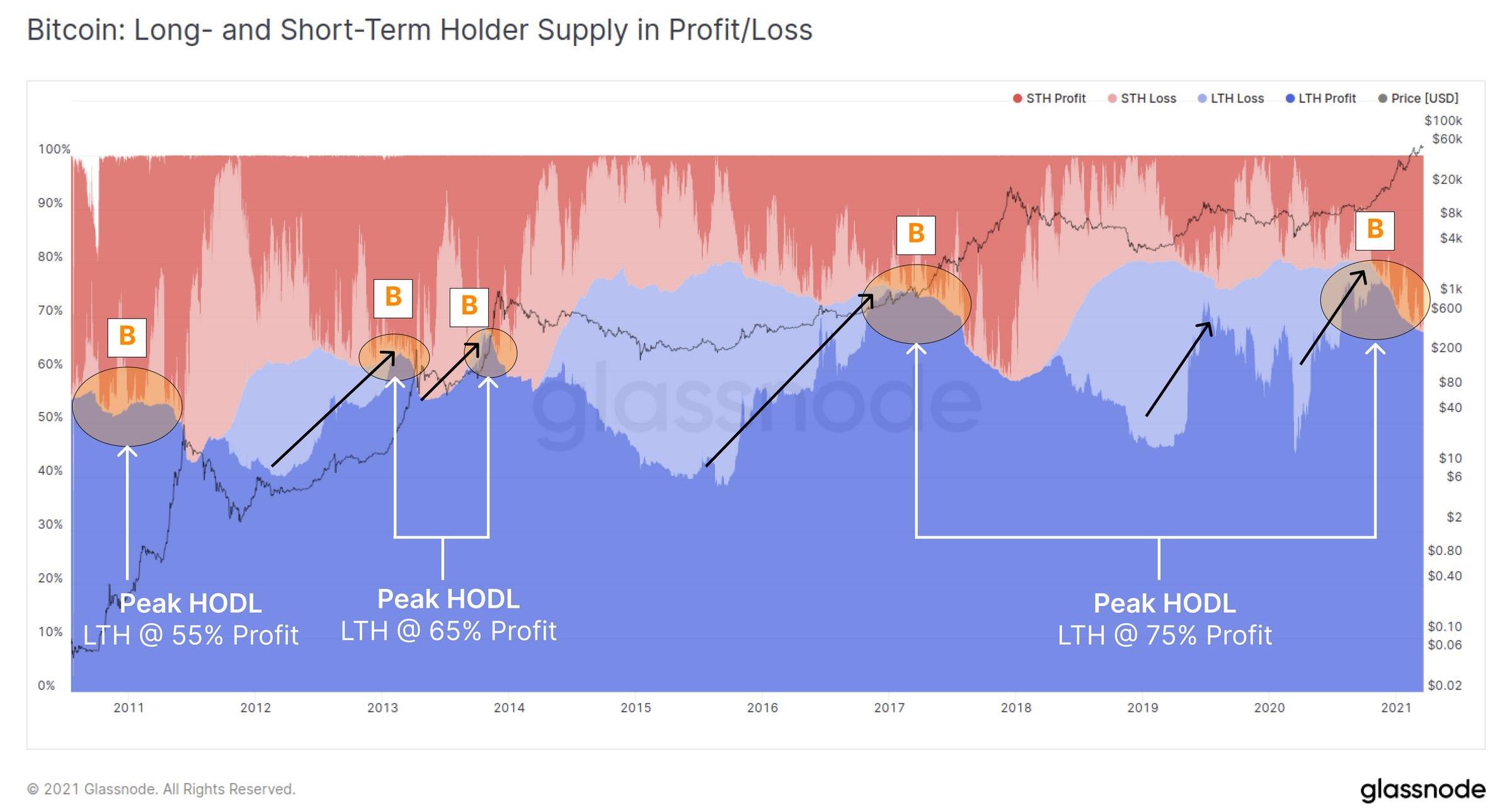 2011年HODL峰值=供应量的55%。