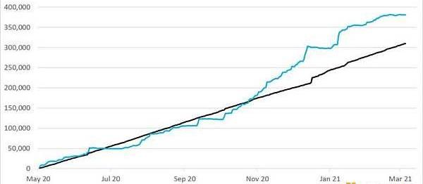 自2020年5月12日比特币上次减半以来,矿工们共挖出了309,557个比特币,而机构投资者共买进了380,644个比特币。因此可以算出,另有净数量71,088个比特币来自二级市场。