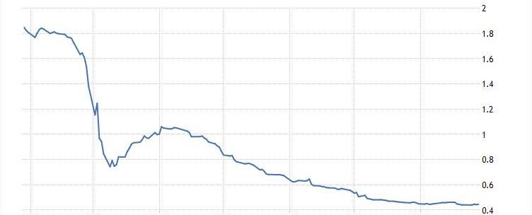 上图为2020年以美元为基准的LIBOR数据,我们可以看到在年初利率最高时只达到了年化1.8%左右,随后下降到0.5%以下。