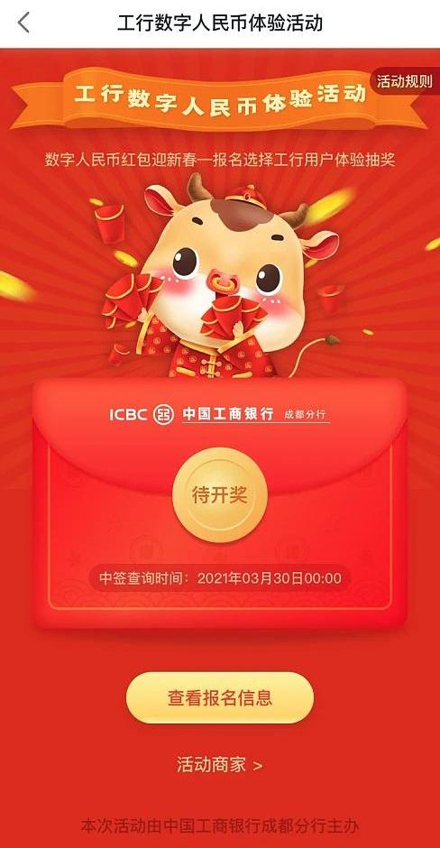 该行将于3月26日通过天府市民云进行摇号抽签,中签名额共计6万人,体验资金分为50元和20元两档。3月30日0时起,市民登录天府市民云APP即可在活动页面查询中签结果。