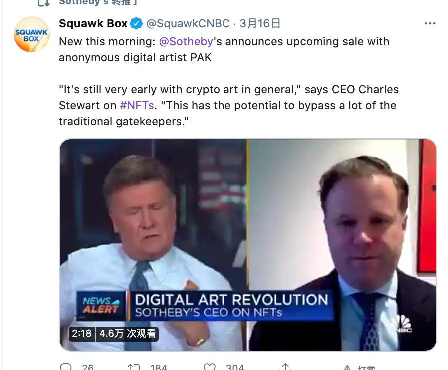 3月16日,据CNBC报道,知名拍卖平台苏富比CEOCharlesStewart宣布,将在下个月拍卖知名艺术家PAK的NFT作品。Charles表示苏富比一直在关注NFT领域的发展,关于PAK的NFT作品拍卖将分别拍卖版和开放版,拍卖版为单间拍卖,开放版为限时不限量抢购。