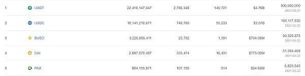 泰达币目前在全球市值排名中为第四名,在以太坊网络的稳定币流通量排行第一位,近期在3月21日增发了5亿枚。USDC在3月22日增发了1.05亿枚,BUSD在3月22日增发了3000万枚,DAI在3月22日增发了5100万枚。