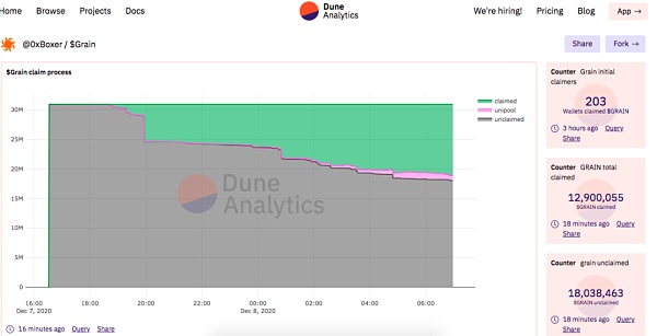 根据GRAIN实时领取数据,截至12月8日下午3点,已有203个地址收取了GRAIN,索赔进度完成约1/3。