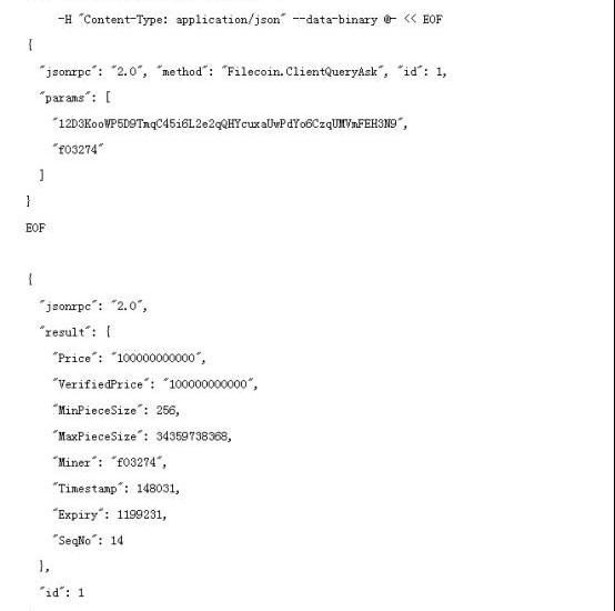 然后你可以用Filecoin.ClientQueryAsk方法查询一个签名的StorageAsk。这将建立一个与所选矿工的直接libp2p连接,并询问存储报价。