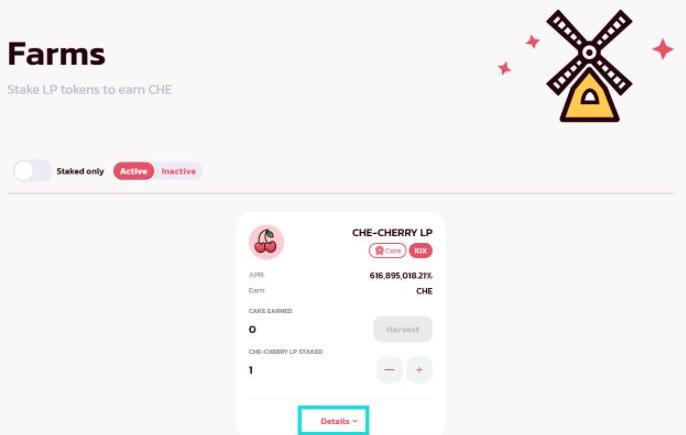 1.点击网页左侧进入农场页面,CherrySwap农场提供多个矿池参与测试,在此以CHE-CHERRYLP池子为例,获取CHE的第一步,就是首先点击进行质押。
