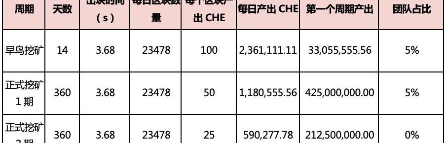 划重点:早鸟挖矿仅仅仅仅持续14天,每个区块产出100枚CHE,想要行动的,趁早动手~!而在代币分配方面,笔者从官网扒到了一些信息: