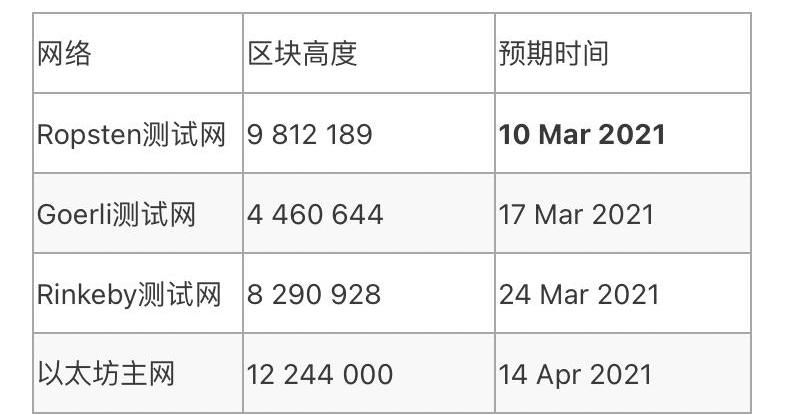 在部署到主网上之前,这次升级将在Ropsten,Goerli和Rinkeby三大测试网上进行。整个发布时间表如下: