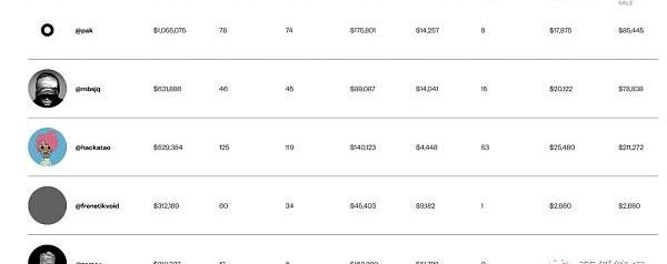在SuperRare上面,加密艺术家@pak一共卖出了价值超过100万美元的数字艺术品,前五名的艺术家销售量都超过30万美元,这些顶级的NFT艺术家们收益非常可观。