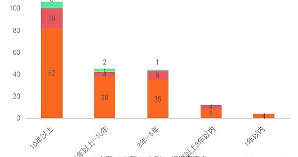 从上市时长来看,211家区块链概念股大多有较长的经营时间,企业发展较为稳定。其中,上市时间3年以上的企业共195家,占比92.42%;上市时间5年以上共151家,占比71.56%;上市10年以上的企业106家,占比50.24%,其中大型企业82家,中型企业18家。