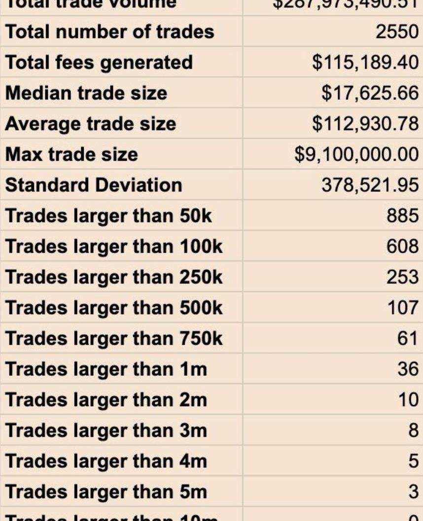 通过交易量接近3亿美元以及按交易规模分出2500笔交易的样本,我们可以推断出,交易量超过100万美元的稳定币交易相对较少。因此,我们可以将100万美元定为Curve以市场领先的表现提供服务的交易阈值,因为更大的交易订单可以拆分。当然,应该指出的是,这一决定是根据数据得出的,但最终是可以酌情修改的:我们可以定为200万美元或50万美元。
