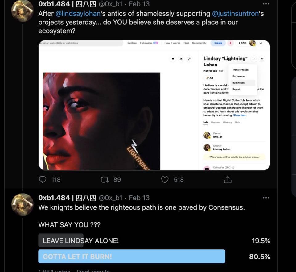 显然,四八四也是这种销毁行为的拥趸者。翻看四八四以前的推特,我们发现,ta曾经根据推特投票执行过一次销毁LindsayLohan发行的NFT藏品的行为,理由是LindsayLohan公开支持过孙宇晨的项目。点击这里看销毁证明。