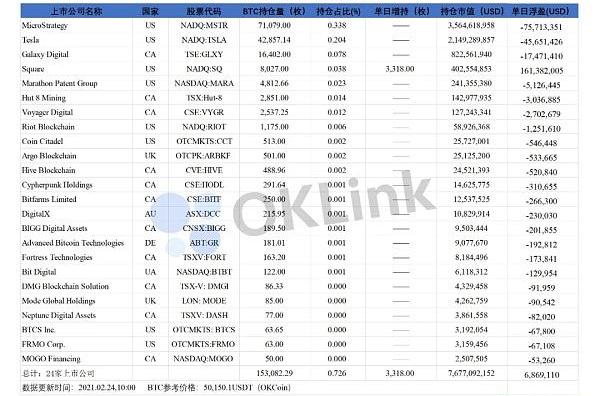 在持仓方面,Square目前两次共计购入了8027枚比特币。去年12月8日,Square宣布斥资5,000万美金购入了4,709枚比特币。第二次则在昨日,在比特币下跌超一万美金的恶劣行情下,Square在第四季度财报电话会议上宣布,再次斥资1.7亿美金购入了3,318枚比特币,超过了MarathonPatentGroup,在上市公司比特币持仓量排名第四。