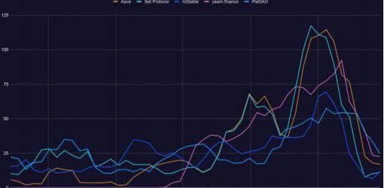 Aave、SetProtocol、mStable、yearn.financial和PieDAO都有一个上升趋势,并在年底出现了一个强劲的峰值。