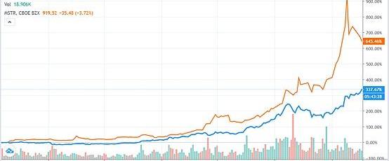 如今的Saylor已经是加密市场的意见领袖,MicroStrategy也成为了想要通过投资比特币对冲通货膨胀的大公司的标杆。投资比特币的这一举动不仅使得MicroStrategy通过加密资产的升值获得了高额利润,甚至MicroStrategy的股票价格也接连走高,涨幅甚至高于比特币。