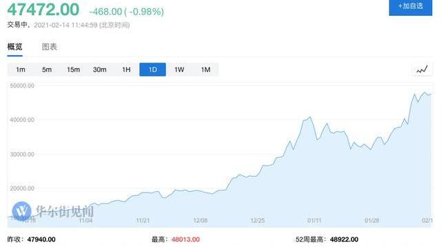 特斯拉宣布投入15亿美元配置比特币,并计划接受加密货币作为支付方式之后,特币等加密数字货币资产似乎走上了被机构接受的快车道。北京时间2月12日早间,比特币价格一度突破49000大关,再创历史新高。目前,币价仍然保持在47000美元以上高位,过去四个月已飙升约4倍,