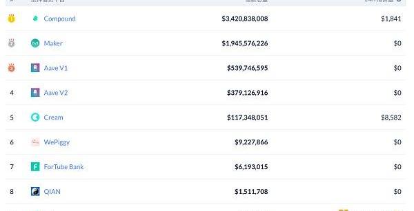 DeFi项目锁定资产前十排名及锁仓量,数据来源:Debank