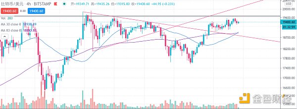 比特币的波动越来越小,放量突破19000美金后,价格一直在19400美金附近震荡,伺机上冲到19500美金上方的重压区间。可以看到日线是很有规律的上升形态,量能在增长收盘价格也在攀升,处在高位看似摇摇欲坠,实则稳扎稳打走的很稳;4小时MA30线与MA83线形成金叉,这是一个很好的信号;OBV上升迅速,终于不再背离,资金入场后有望继续冲击19500美金上方。目前相当于决战前夕,放量攻破19500-20000美金后,上方就是星辰大海,不过风险也比较大,19700美金附近的抛压较重,为了防止10000附近时候的反复收割,各位最好减轻杠杆,现货为主。