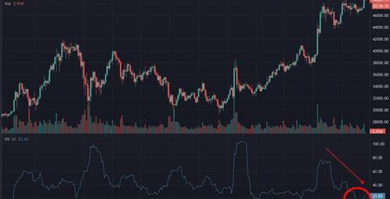 这种交易量的减少,从比特币年初至今的波动率曲线也可以看出,这表明比特币处于低波动率环境。市场似乎在等待进一步确认5万美元的阻力位以及4万美元的支撑位。