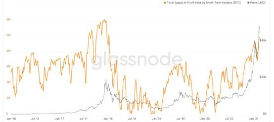 因此,跟踪处于获利状态的短线供应非常重要,因为任何超过一定幅度的价格变化都会引起大规模的短线抛售。这种效应在牛市后期会变得极端,因为短线持有者对价格变动越来越敏感。