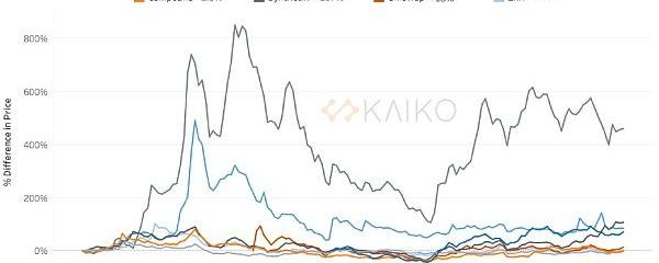 从有记录的数据里可以看出,以太坊上的DeFiToken为平台创造了高额收益并带来源源不断的资本流入了这个新兴生态系统里。今年秋天,比特币的价格反弹又给以太坊注入了新的活力,使得与年初相比,以太坊上的大多数Token价格在夏天有所上涨。但有些可惜的是,以太坊上Token价格在现阶段还没有回到之前的水平。