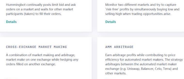 Hummingbot采取多管齐下的方式为交易员、交易所、开发者以及代币发行方提供服务。对于交易者而言,可以应用Hummingbot的四种策略模板,分别为做市、套利、跨交易所做市以及自动做市套利。做市策略为Hummingbot在一个市场中不断发布限价买单和要价订单,套利为在两个市场中进行低买高卖,跨交易所做市结合了做市和套利两个策略。另外,交易者还可通过Hummingbot参与其他项目的DeFi流动性挖矿活动。