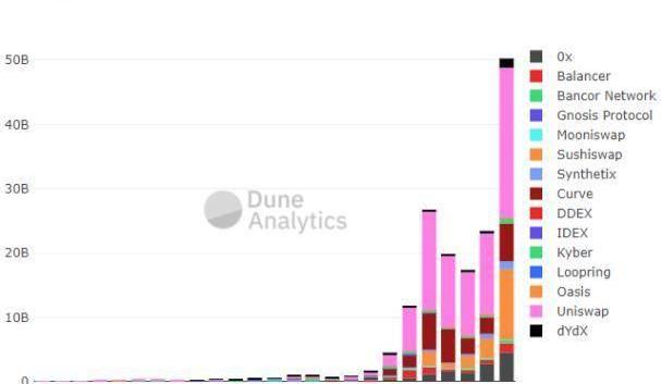进入2021年,加密市场看似并无从2020年年底的热潮中退烧的迹象,随着新一轮普涨的到来,1月去中心化交易所成交量再度大幅改写了原有的历史记录,月成交量突破了500亿美元,DEX用户总量也已超过118万人,加密货币交易竞赛的天平又一次开始向着DEX倾斜。