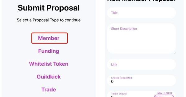 1、通过Daohaus申请加入一个DAO,你只需要提交提案,提供一些关于你的信息,以便其他DAO成员了解你。其次确认你打算出多少Tribute(也可理解为质押多少Token)来换取多少Share。