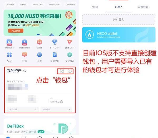 第二步:打开火币钱包,在首页中间会出现“创建”按钮,勾选HECO,点击创建钱包