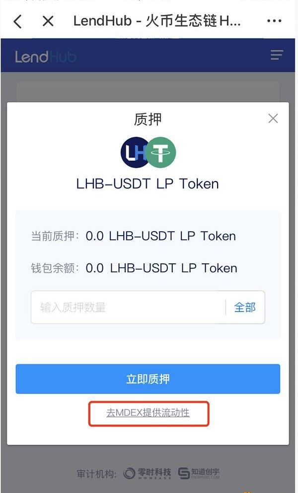 6、进入后,币种选择和输入质押的LHB和USDT的数量,最后点击,调用合约确认后,质押成功并获得USDT/LHB的LPToken