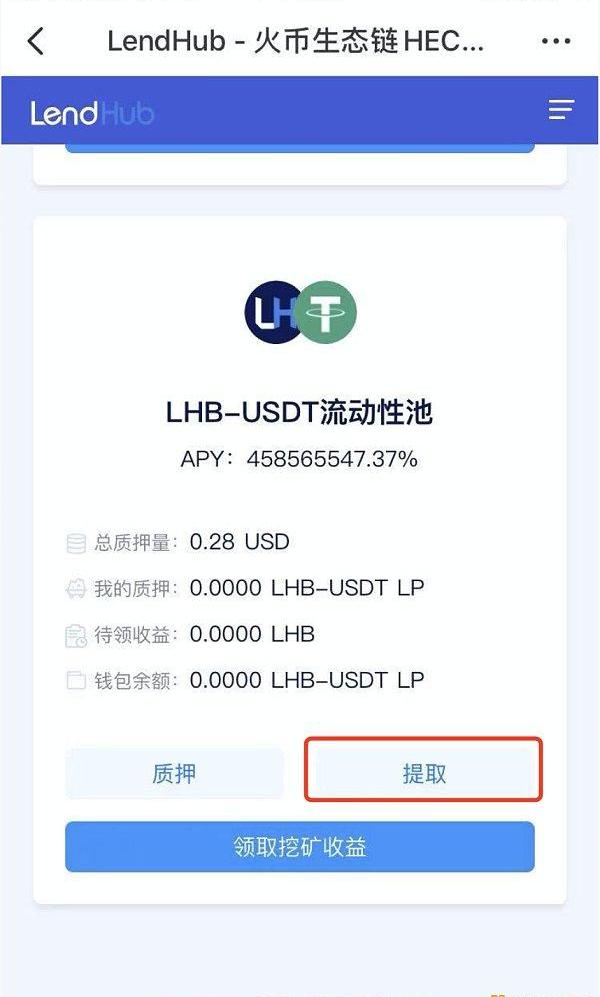 6、返回LendHub质押页面,选择LHB-USDT,点击