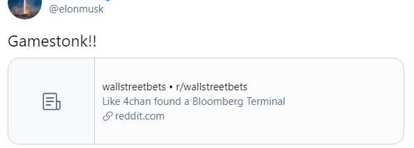 与此同时,全球顶级KOL、特斯拉CEOElonMusk也发布推特,大呼「Gamestonk!」。也许Musk也联想到此前特斯拉被多家机构联手做空时候的落魄时刻,为这一刻GME的绝地反击感到了兴奋。