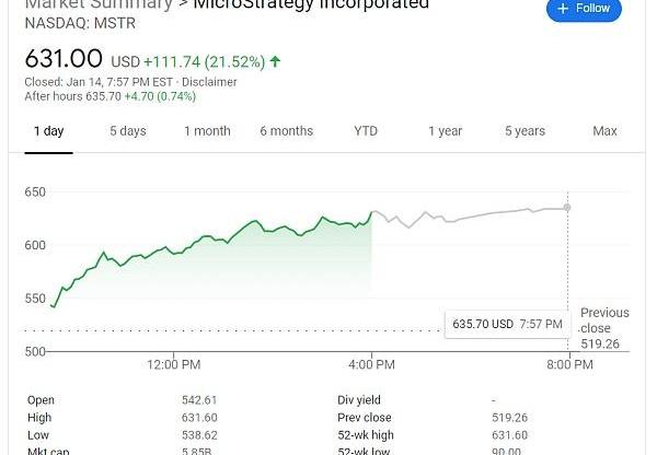 它是一家纳斯达克上市公司,买入比特币前,股价在120美金左右,而现在,它的股价创造了631美金的历史新高。