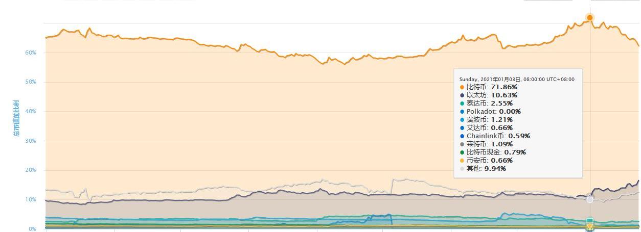 根据来自coinmarketcap的数据显示,自进入1月以来比特币的市值占有率呈现出持续走低态势,而ETH市值占比在此期间明显增长,于此同时也包含一些中小市值币种。这种现象一般都出现在牛市中,说明现在市场整体情绪偏向于乐观状态。
